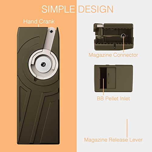 - 【Unique Design】 Hand crank design to rapidly load BBs. Magazines lock to prevent magazines from dropping. Built-in O-ring in feeding nozzle keeps BBs from falling out.